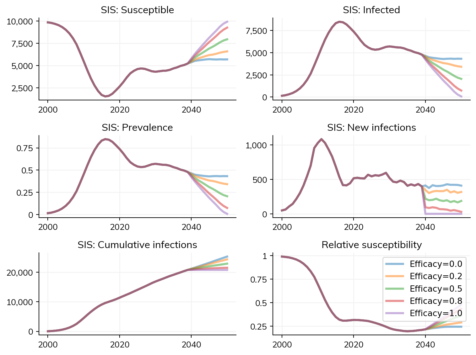 s = ss.Sim(pars, label=f'Efficacy={eff}', interventions=sis_vaccine(eff=eff))