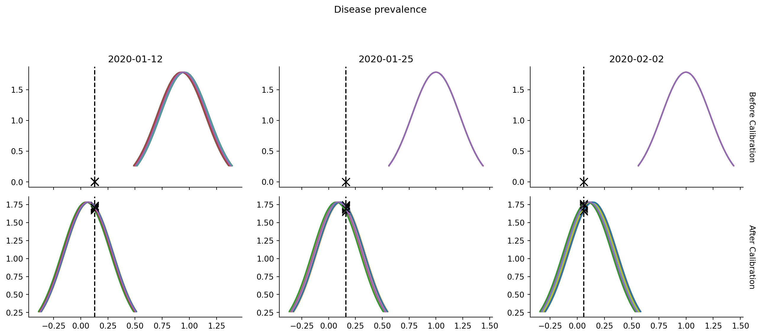 After calling check_fit, we can plot the results. This first plot shows the Normal likelihood distributions from each of the 15 simulations we did in check_fit as the colored lines. The vertical dashed line is located at the real (expected) data. Top row is the “guess” values and the bottom row is the new “best” parameters. We want the vertical dashed line to cross the Gaussians at high points, representing high likelihood.