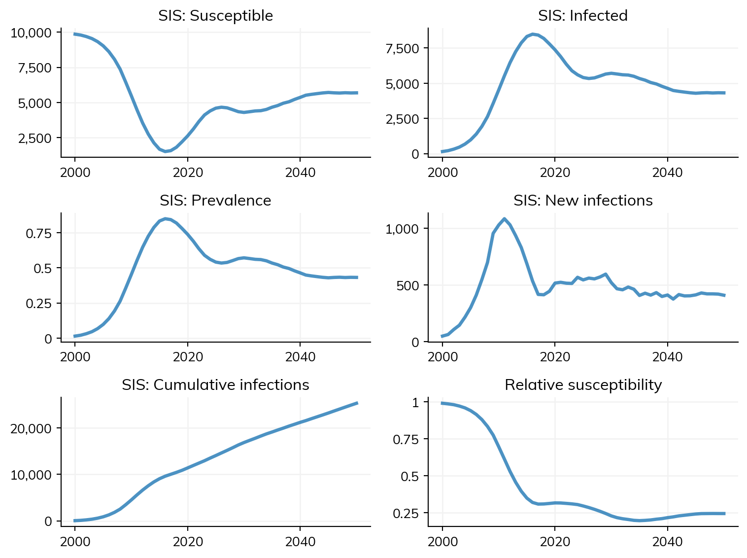 s1 = ss.Sim(diseases='sis', networks='random')s2 = ss.Sim(diseases='sir', networks='random')ss.parallel(s1, s2, verbose=0, inplace=False)s1.run().plot() # This now works, because the sim was *not* run in place