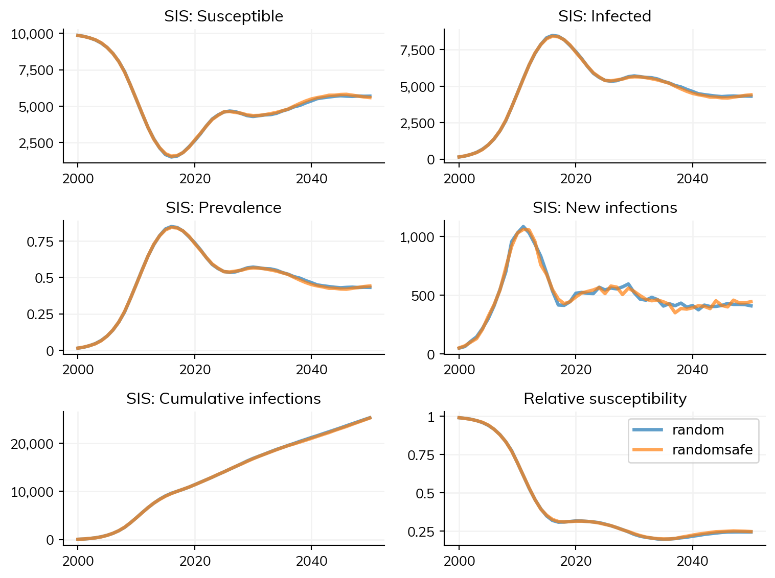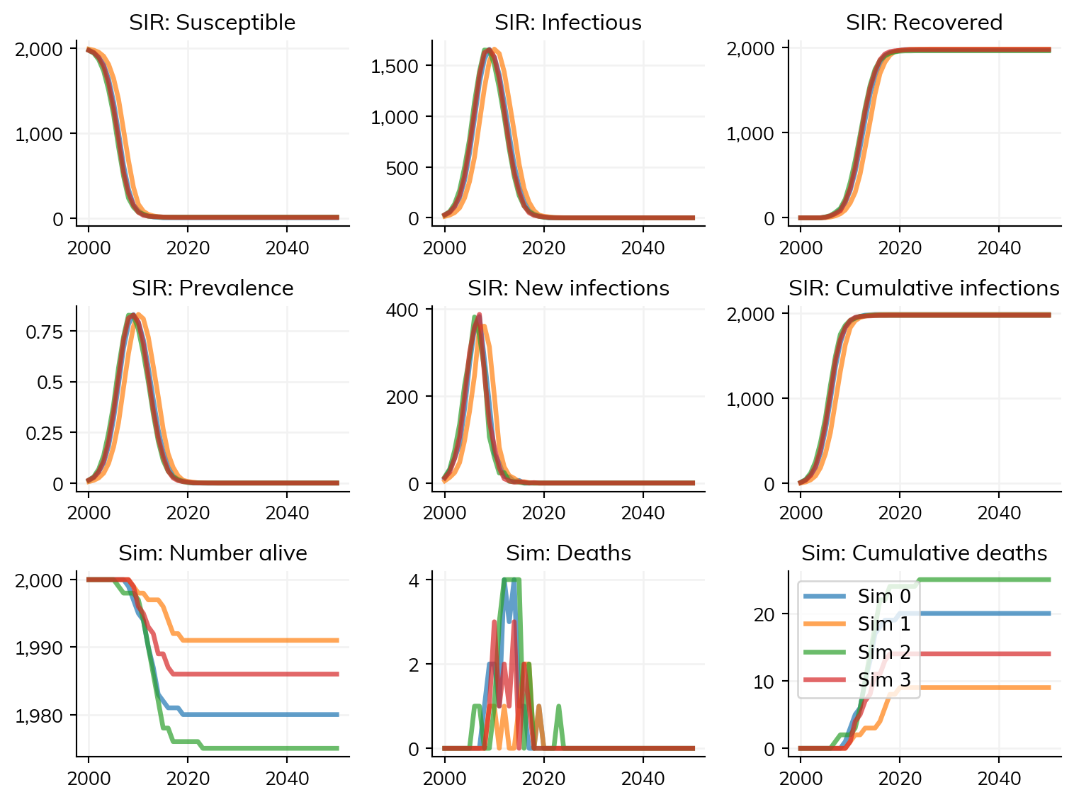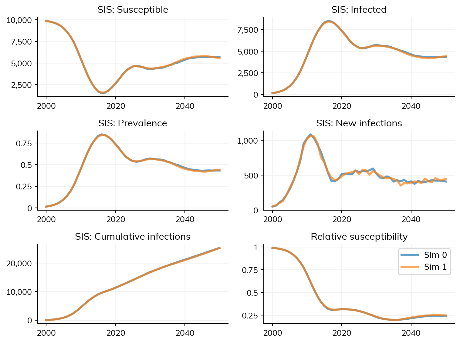 In most cases, this is the most efficient workflow: make some sims (potentially via a loop), and then run them. But there are some other common workflows as well. One is to run the same simulation with different random seeds. This is what happens by default if you call ss.MultiSim() with a single sim: