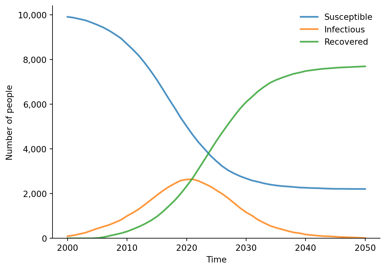sir = ss.SIR(beta=0.035)sim = ss.Sim(diseases=sir, networks='random', copy_inputs=False)sim.run()sir.plot() # This wouldn't work without copy_inputs=False