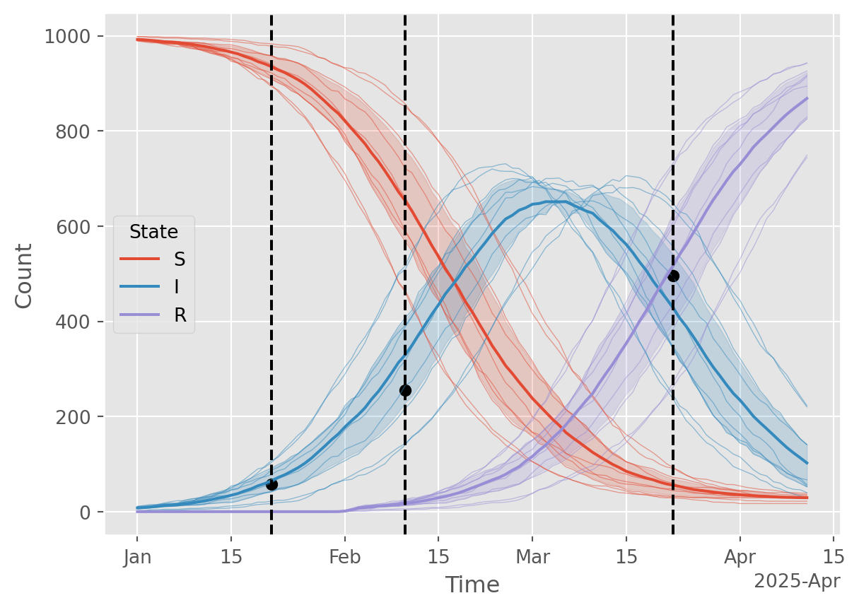 Here, we use that SIR disease model to test two calibration workflows. The goal is to assess if they able to re-identify a known “true” set of parameters and explore the resulting latent trajectories. The two workflows demonstrated are: 1. Likelihood maximization using the optuna package as integrated with Starsim 2. Posterior sampling using a Bayesian workflow