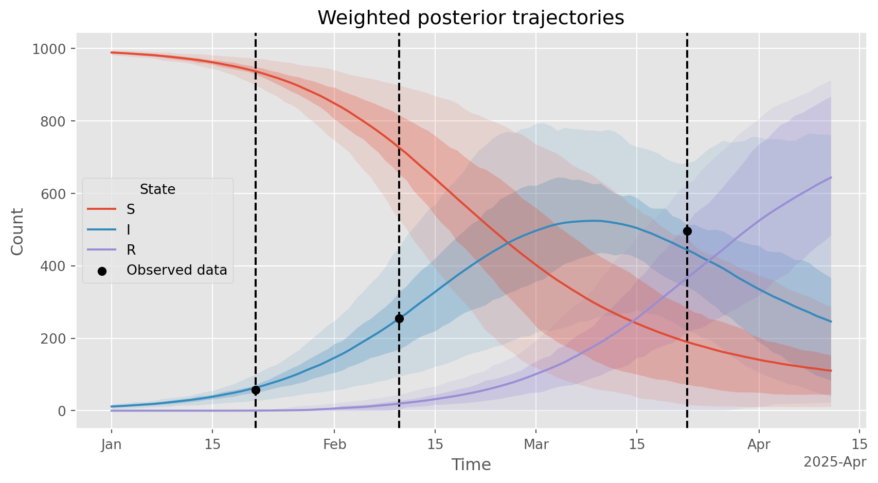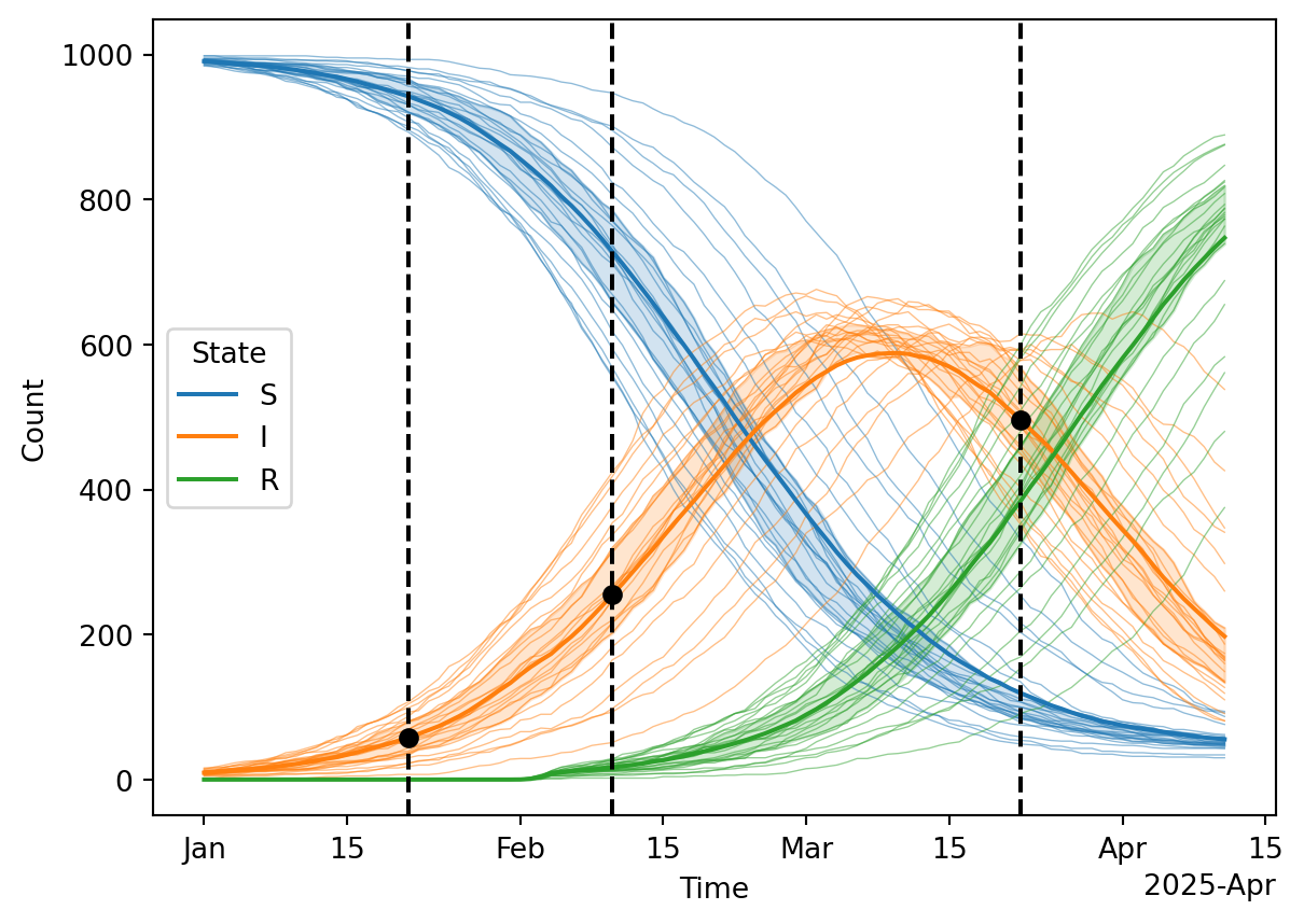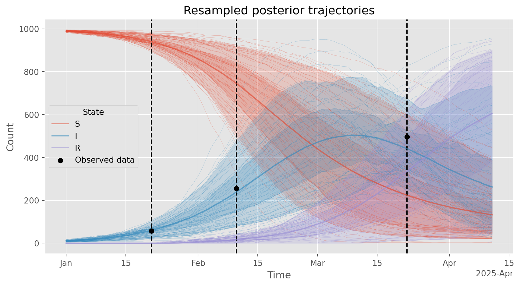 The next step would be scenario analysis using these \(K\) resamples parameters and latent trajectories. Each of these \(K\) samples represents a different possible future trajectory of the epidemic, and the ensemble of these \(K\) trajectories can be used to quantify uncertainty in future projections. Each of these \(K\) trajectories should be simulated forward \(M\) times for each scenario, using common random numbers, to produce final results.